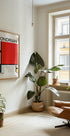 Une œuvre abstraite emblématique de Piet Mondrian, créée en 1930. L'œuvre présente de forts champs de couleurs en rouge, bleu, jaune et blanc, séparés par d'épaisses lignes noires, représentant le style unique d'abstraction géométrique et d'équilibre de Mondrian.