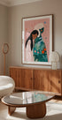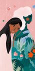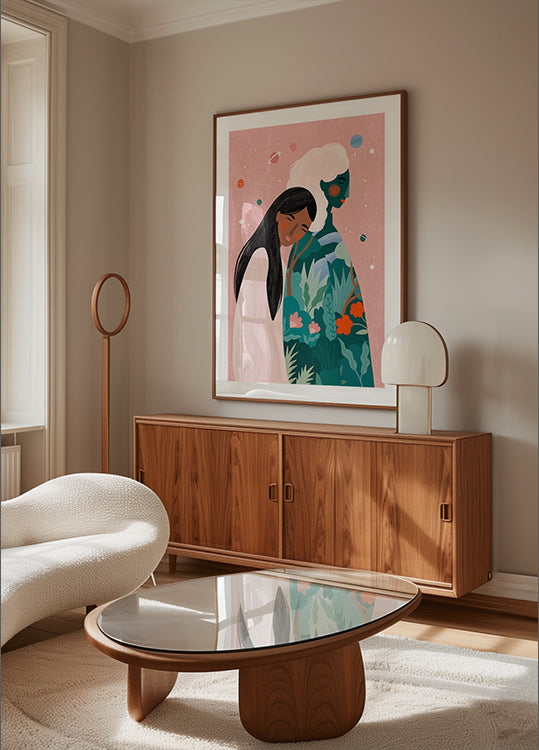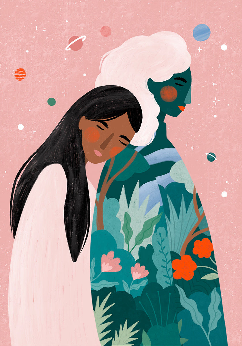 Une illustration symbolique et moderne montrant deux femmes entourées d'éléments cosmiques et d'une nature luxuriante. L'œuvre d'art exprime des thèmes tels que la protection, la maternité, l'amitié et l'harmonie entre l'homme et la nature.