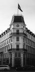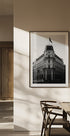 Une majestueuse photographie en noir et blanc d'un bâtiment historique de Copenhague, couronné d'un clocher et d'un élégant drapeau. Reflétant le charme européen intemporel, la façade détaillée et la grande symétrie font de cette impression une œuvre d'art murale sophistiquée pour les intérieurs inspirés par l'architecture, la culture et la vie urbaine classique.