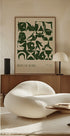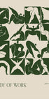 Une affiche figurative saisissante d'Arty Guava (2024), présentant des formes corporelles abstraites audacieuses en vert foncé sur fond beige. L'œuvre explore la forme, le mouvement et l'expression humaine dans un style graphique moderne.