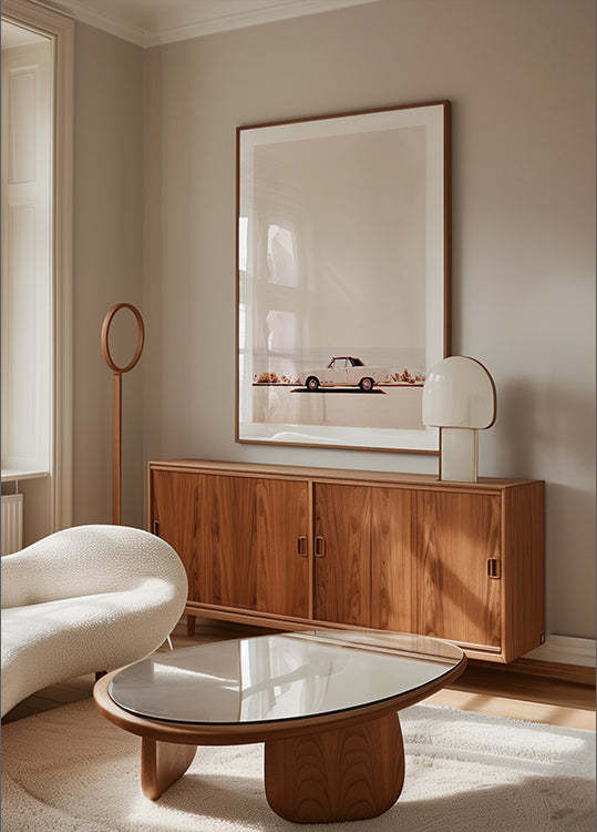 Une photographie minimaliste et nostalgique d’une décapotable vintage garée au bord de la mer. Cette œuvre d'art capture l'essence de la côte californienne et évoque des souvenirs de road trips, de journées d'été et de charme rétro intemporel.