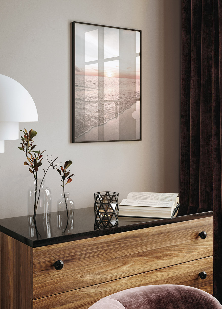 Une affiche représentant une belle et tranquille plage avec un coucher de soleil rose, parfaite pour ajouter une atmosphère relaxante et esthétique à n'importe quelle pièce.