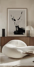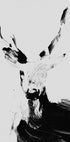 Un autre motif abstrait de cerf en noir et blanc, où les bois s'étendent élégamment vers le haut en longs coups de pinceau fluides. Le motif est minimaliste mais puissant, transmettant à la fois le mouvement et l'immobilité.