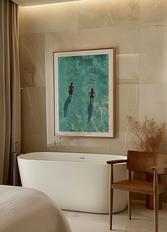 Un motif apaisant et touchant représentant un couple debout dans une eau turquoise claire et peu profonde. Leurs ombres sur le fond marin ajoutent de la profondeur et un sentiment d'unité. Cette œuvre est parfaite pour créer une atmosphère romantique et estivale dans votre maison ou votre chalet.