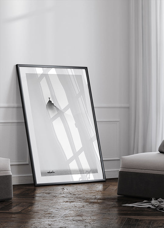Une sereine photographie en noir et blanc capturant la statue emblématique du Christ Rédempteur à Rio de Janeiro, se dressant majestueusement au-dessus du brouillard. L'atmosphère brumeuse crée une atmosphère spirituelle et contemplative, tandis qu'un petit bateau à rames sur l'eau souligne l'ampleur et la profondeur de la scène. Une œuvre intemporelle qui allie monumentalité et sérénité, parfaite pour les amateurs de photographie religieuse, architecturale et minimaliste.
