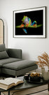 Un gros plan saisissant d'une rainette aux yeux rouges (Agalychnis callidryas) perchée sur une tige verte sur un fond noir profond. Le corps vert vif, les pieds orange et les yeux rouge vif créent une composition fantastique pleine de couleurs et de mystère. Cette impression macro nature est parfaite pour les amoureux des animaux, les amoureux de la nature ou ceux qui veulent un art mural audacieux et exotique.
