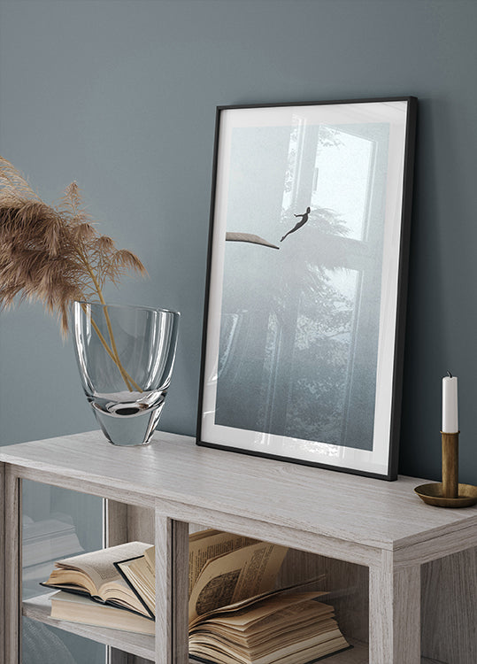 Une œuvre épurée et symbolique représentant une silhouette sautant d'un bord vers l'inconnu. L'affiche capture un moment de confiance, de courage et d'abandon, idéal pour les espaces contemplatifs et de réflexion.