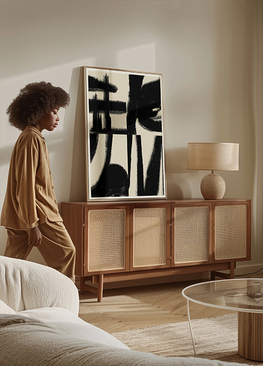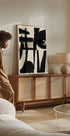 Une œuvre d'art abstraite monochrome saisissante avec de forts coups de pinceau noirs sur un fond neutre. Les lignes texturées et les formes expressives créent un équilibre dynamique entre mouvement et immobilité, ce qui en fait une déclaration moderne dans un décor contemporain.