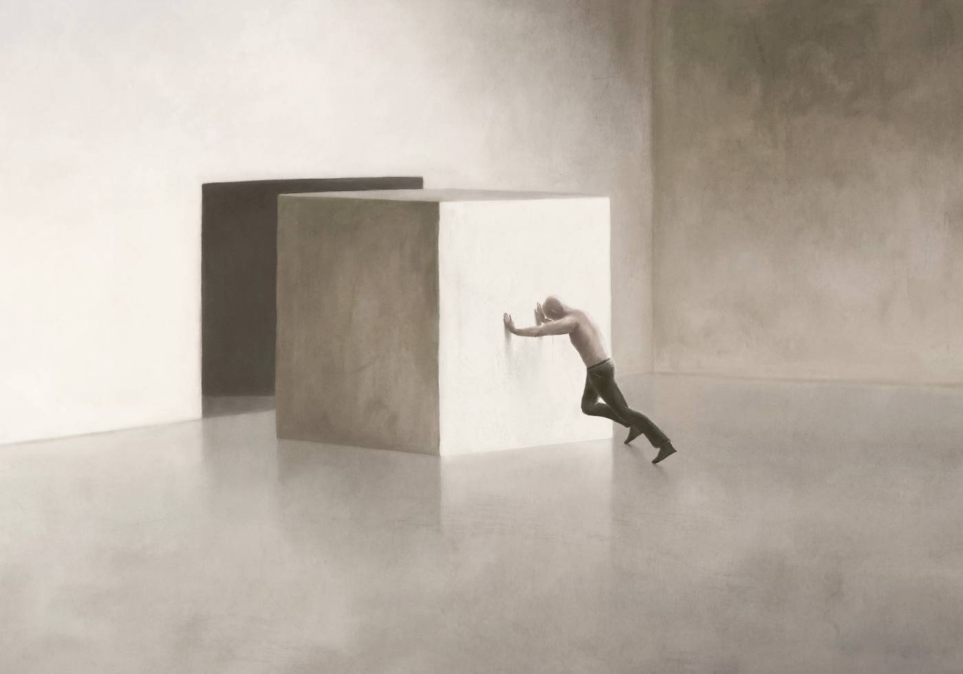 Une œuvre d'art minimaliste et puissante représentant une silhouette solitaire luttant contre un cube géant. Cette image surréaliste symbolise la lutte, la persévérance et les défis de la vie. Une affiche idéale pour ceux qui apprécient un art profond et stimulant, avec une expression moderne.
