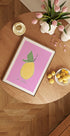 Une œuvre d'art pastel vibrante représentant un citron aux feuilles vertes sur fond rose, avec le texte « le citron ». Une affiche de cuisine moderne et ludique, parfaite pour ajouter de la couleur et de la fraîcheur à vos murs.