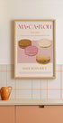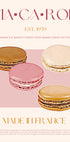 Affiche de macarons français représentant des gâteaux colorés à base de meringue, soulignant leurs origines et leur création en 1959. Le design met en valeur les produits de boulangerie traditionnels, les couleurs vives et l'art de la pâtisserie française.