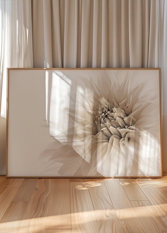 Un gros plan raffiné d’un dahlia dans de doux tons sépia. Le style monochrome et les détails délicats des pétales confèrent à la pièce une élégance intemporelle et digne, parfaite pour les intérieurs calmes et modernes.