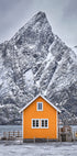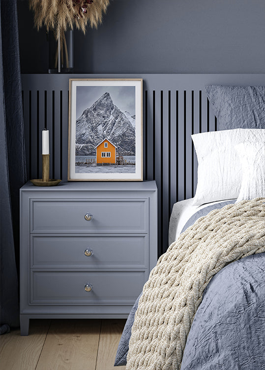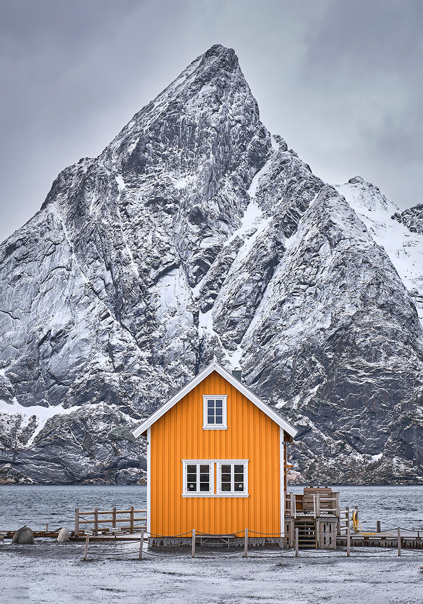 Cette affiche évocatrice de Hamed Bank représente une cabane jaune solitaire sur une côte nordique, entourée de montagnes enneigées et d'une mer bleu foncé. Des nuages spectaculaires dérivent dans le ciel, tandis que la lumière hivernale accentue le contraste entre les couleurs chaudes de la maison et le paysage frais et glacial. Une scène calme, brute et intemporelle qui invite à la réflexion.