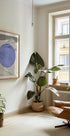 Blue Echoes d'Athene Fritsch allie minimalisme cool et poésie graphique : une silhouette de montagne en noir et blanc est brisée par des cercles concentriques d'un bleu profond qui envoient des échos visuels à travers un paysage glacial. Une déclaration moderne et géométrique avec une énergie calme, un contraste net et une élégance hivernale. Parfait comme point focal dans le salon ou au bureau.