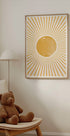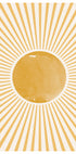 Cette œuvre d'art présente un design minimaliste en forme de rayon de soleil avec un cercle central qui rayonne des lignes droites créant un motif géométrique audacieux. L'utilisation de couleurs chaudes donne une touche rétro et vintage, parfaite pour un décor moderne et une expression artistique.