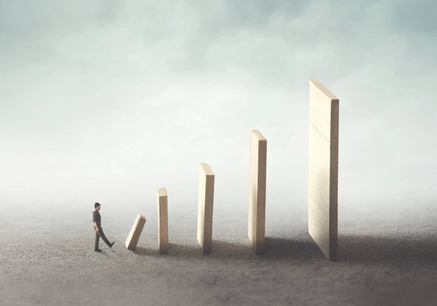 Une métaphore visuelle surréaliste : un petit homme poussant le premier d'une longue série de dominos. Une image puissante qui illustre comment de petites actions peuvent avoir de grandes conséquences, idéale pour les espaces de réflexion et de motivation.
