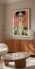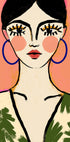 Une affiche de portrait de mode vivante et élégante d'une femme avec des cils audacieux, de grandes boucles d'oreilles et des couleurs élégantes. Le fond de couleur pêche et les textures pittoresques lui confèrent une expression artistique moderne, ce qui en fait une pièce accrocheuse dans les intérieurs modernes.