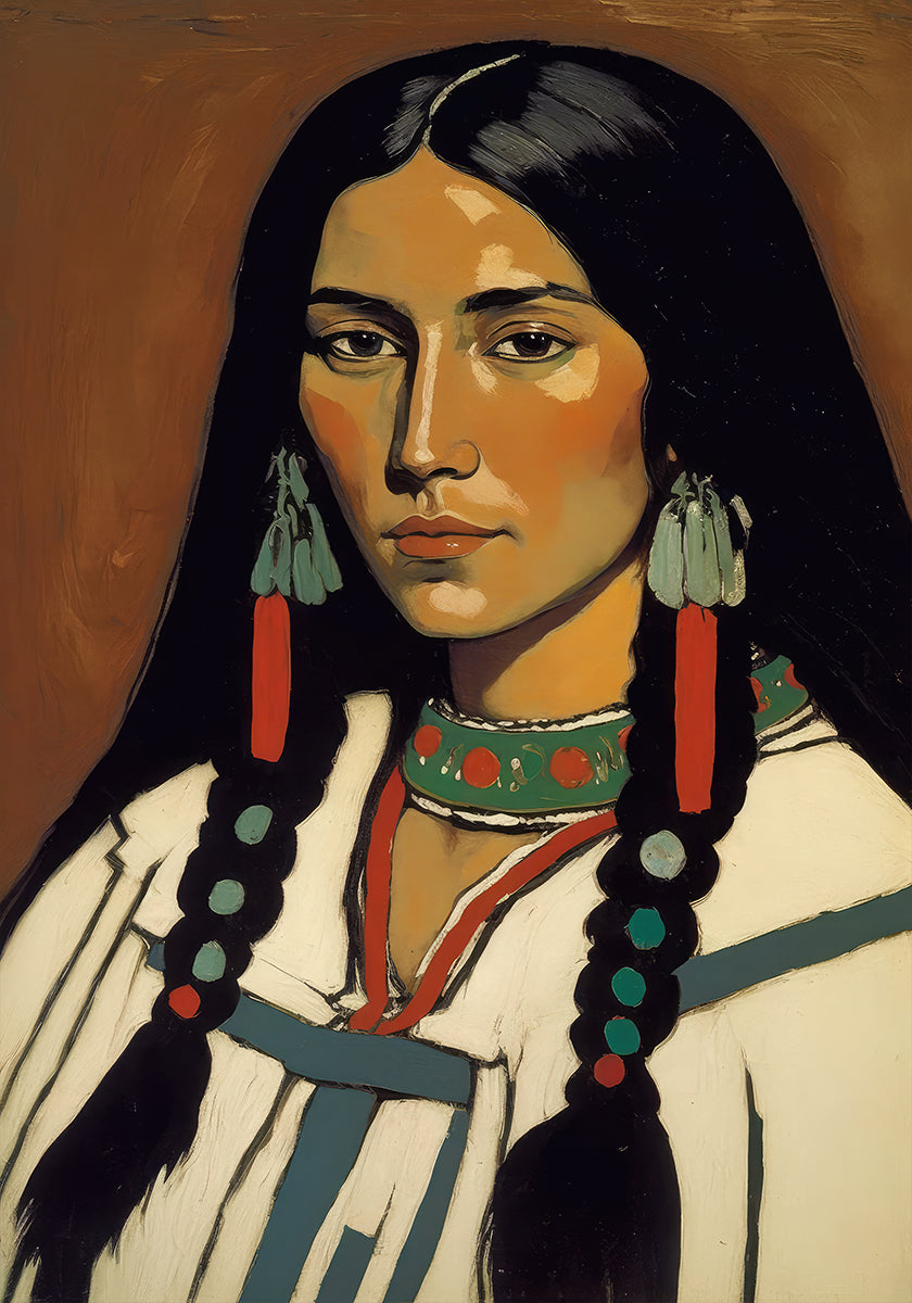 Elegance of Heritage de Treechild dépeint une femme équilibrée vêtue d'une tenue traditionnelle, ses cheveux tressés et son regard fixe encadrés par des coups de pinceau expressifs. Des tons de terre chauds et des accents vibrants tissent une histoire d'identité et de grâce, mêlant charme vintage et couleurs contemporaines pour un portrait calmement puissant.