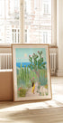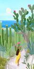 Une illustration colorée d’un jardin méditerranéen avec des cactus luxuriants, des plantes succulentes et des plantes exotiques surplombant la mer. Une femme vêtue d'une robe jaune marche le long du chemin de pierre, évoquant un sentiment d'exploration, de tranquillité et de beauté naturelle. Parfait pour apporter une ambiance estivale et un charme botanique dans n’importe quelle pièce.
