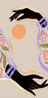 Une illustration figurative moderne de deux mains noires tendues vers un soleil orange éclatant. Les bras sont ornés de manches florales aux tons pastels doux, créant un mélange poétique de beauté botanique et de minimalisme abstrait. L'œuvre symbolise l'harmonie, l'énergie et la connexion avec la nature.