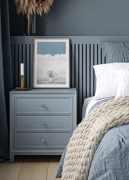 Une œuvre d'art calme et poétique représentant un personnage solitaire assis au bord d'un arbre, tenant un parapluie bleu pâle, le regard fixé sur le ciel. Les nuages s'amoncelant au-dessus, créent une atmosphère paisible et pensive. Cette composition minimaliste et onirique évoque le désir, la solitude et la sérénité. Parfaite pour les intérieurs modernes, les espaces de méditation et pour ceux qui apprécient la sérénité artistique.