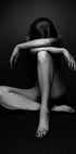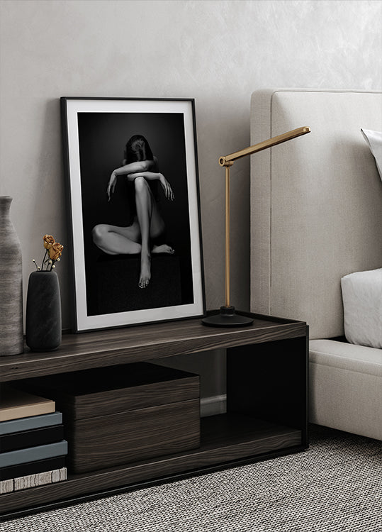 Une photographie d'art forte en noir et blanc d'une femme assise exprimant une émotion brute, une sensualité et une vulnérabilité. Avec un éclairage dramatique et une expression monochrome, l'œuvre évoque les thèmes de la tristesse, de la force et de la mélancolie, et devient une œuvre d'art mural figurative accrocheuse.