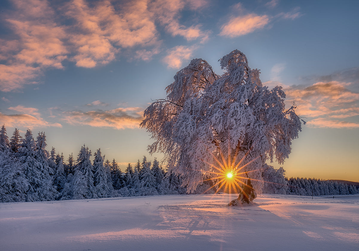 Un matin d'hiver glacial sur le Schauinsland : le soleil se lève comme une étoile du matin à travers la couronne couverte de givre, projette de longues ombres sur le paysage blanc et colore le ciel de tons bleus froids. Judith Kuhn capture la poésie tranquille de la nature, où le froid, la lumière et le calme se rencontrent dans un motif hivernal intemporel. Un accroche-regard pour la maison et une pause tranquille pour les yeux.