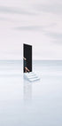 Une œuvre d'art conceptuelle surréaliste représentant une personne franchissant une porte sombre au-dessus d'eaux calmes et réfléchissantes. L'agencement minimaliste, avec un escalier menant au néant, évoque des thèmes tels que l'évasion, le départ et le nouveau départ. La scène mélange le surréalisme onirique avec une esthétique inspirée du milieu du siècle.