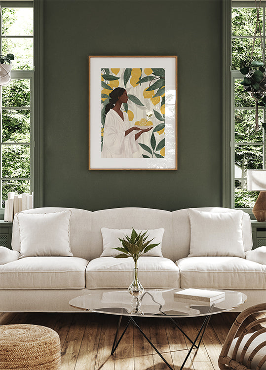 Une œuvre d'art élégante et moderne représentant une femme gracieuse dans une citronnière, tenant un bol de citrons frais. Les fruits jaunes clairs contrastent magnifiquement avec les feuilles vertes luxuriantes et créent une composition calme et élégante pour la maison ou le bureau.