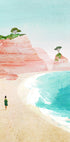 Une illustration côtière paisible représentant une silhouette solitaire marchant le long d’une plage de sable avec des vagues turquoise et des rochers rouges en arrière-plan. Inspirée de la côte de l'Algarve au Portugal, cette œuvre capture le calme et l'harmonie de l'été au bord de la mer.