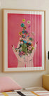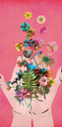 Une œuvre d'art vibrante et moderne montrant des mains libérant une explosion de fleurs et de feuilles colorées sur un fond rose. Le collage floral unit nature et créativité et symbolise la croissance, le renouveau et la beauté. Parfait pour les intérieurs modernes avec une touche de charme botanique.