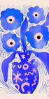 Un hommage audacieux et ludique à Matisse, avec un vase vivant rempli de fleurs bleues éclatantes sur fond clair. Le design combine des motifs graphiques avec des éléments floraux et crée une nature morte vivante et moderne, idéale pour les intérieurs contemporains.