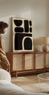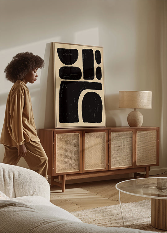 Une œuvre d’art abstraite saisissante avec des formes noires audacieuses sur un fond beige doux. Les formes organiques et les coups de pinceau texturés créent une esthétique moderne et minimaliste, parfaite pour les intérieurs contemporains, les murs de galeries ou pour tous ceux qui aiment un design épuré mais artistique.