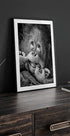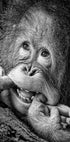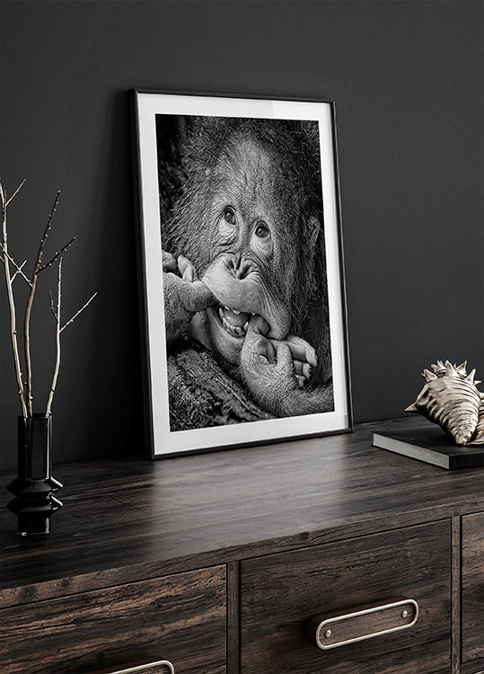 Un portrait en noir et blanc humoristique et réconfortant d’un jeune primate à l’expression ludique. L'image capture la joie, l'innocence et un sourire effronté, ajoutant chaleur et humour à n'importe quel mur.