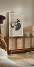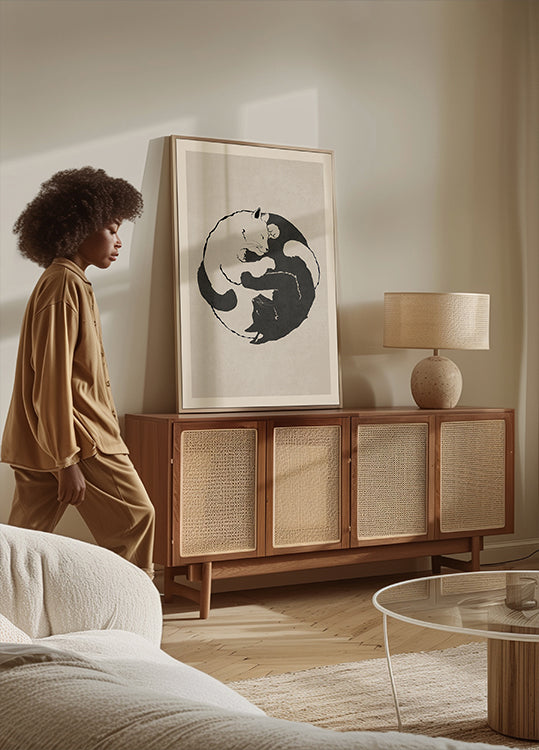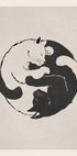 Une affiche d'art minimaliste en noir et blanc représentant deux chats couchés ensemble dans une formation yin-yang, symbolisant l'équilibre, la paix et l'harmonie. Une pièce contemporaine parfaite pour les amoureux des chats et ceux qui apprécient un design calme et moderne.