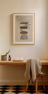 Une composition paisible et minimaliste avec des pierres zen soigneusement équilibrées dans des tons chauds de terre, sur un fond beige doux avec des ombres abstraites de feuilles de palmier. Cette œuvre d'art dégage calme, présence et équilibre naturel, idéale pour les espaces bien-être, les coins yoga ou une décoration d'inspiration scandinave.