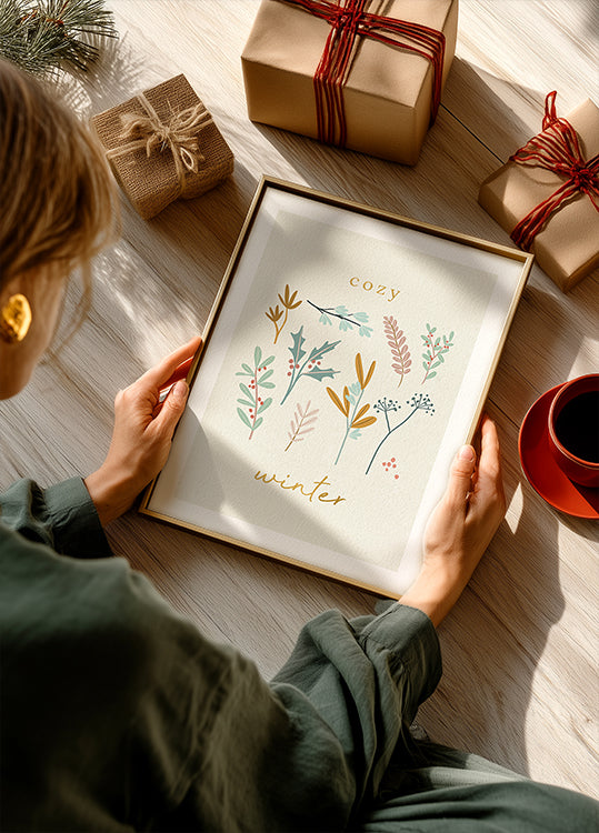Les branches et les fleurs botaniques d'hiver aux doux pastels rencontrent de fins accents dorés et une typographie manuscrite qui murmure Cozy Winter. Les détails givrés et les légers flocons de neige apportent à la fois paix et chaleur, parfaits pour Noël et les soirées sombres. Une affiche saisonnière élégante de Goed Blauw. Parfait pour hall d'entrée, salon et chambre d'enfants.