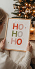 En legende, moderne juleplakat med det ikoniske “HO HO HO” sat i stor, grafisk typografi. Klare rød-, grønne og rosa farver skaber stærke kontraster og en frisk, minimalistisk stemning. Den rene komposition og rytmen i gentagelsen giver væggen energi og øjeblikkelig julestemning. Perfekt som grafisk statement i stue, entré eller børneværelse.