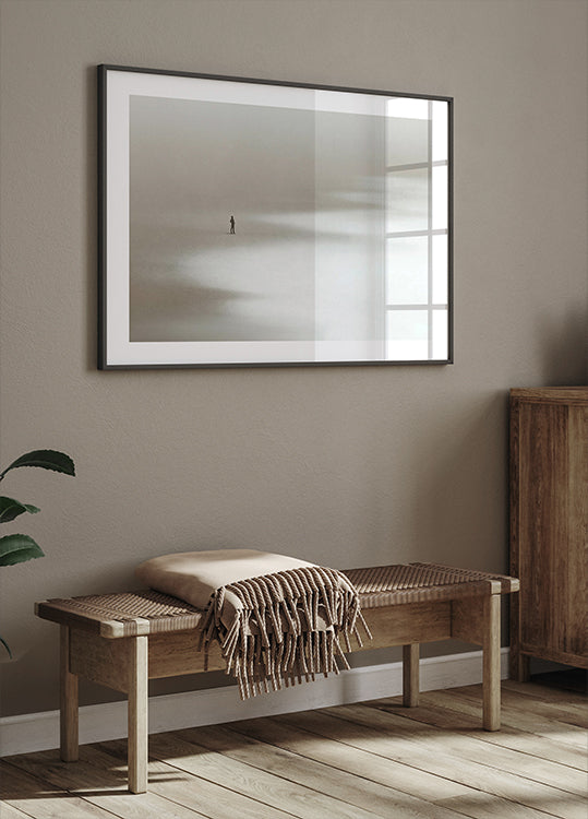 Une personne se tient immobile sur une plage brumeuse, entourée d'ombres douces. Une œuvre onirique et minimaliste qui évoque le calme, la réflexion et la puissance du silence.