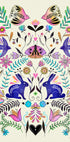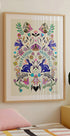 Une affiche animée inspirée de l'art populaire avec des lapins, des oiseaux, des papillons et des fleurs épanouies en miroir dans un style ludique et décoratif. Avec son charme rural nordique et ses couleurs vives, l'illustration apporte à la fois chaleur et imagination à tout intérieur.