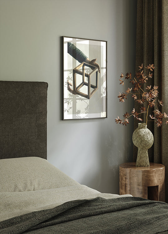 Une affiche simple et fascinante représentant un cube impossible. Les teintes chaudes et l'illusion d'optique créent un paradoxe visuel captivant dans une expression sereine.