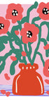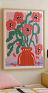 Une illustration ludique et minimaliste de coquelicots rouge vif dans un vase orange saisissant. Avec un fond rose pastel et des contrastes de couleurs vibrants, cette œuvre d'art apporte une ambiance fraîche, moderne et joyeuse à n'importe quelle pièce.