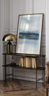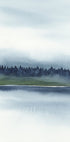 En stille morgentåge svæver over en spejlblank sø, hvor indigo-blå nuancer opløser horisonten og skoven træder frem som bløde silhuetter. Fine skyer og let dis indrammer vandet, mens græs og træer antyder dybde og ro. En stemningsfuld naturkomposition af Rachel Elise, der indbyder til fordybelse og nærvær.