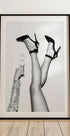 Une photographie de mode élégante en noir et blanc qui capture les talons hauts, le champagne et l'élégance ludique. Le contraste minimaliste crée une atmosphère de fête audacieuse, parfaite pour les intérieurs modernes et les décorations murales inspirées de la mode.