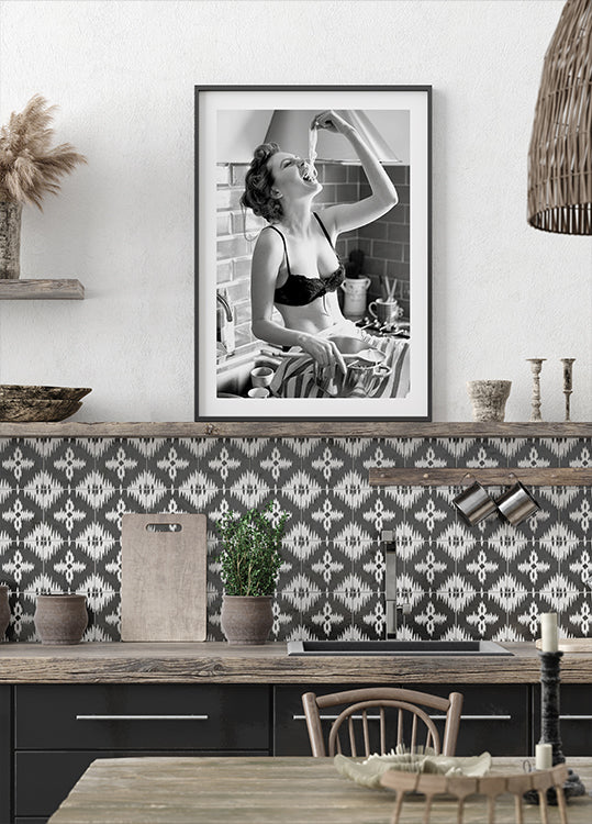 Une photographie en noir et blanc ludique et audacieuse d’une femme dégustant des spaghettis dans une cuisine d’inspiration vintage. Avec une attitude détendue, elle respire la confiance et l'humour, faisant de cette œuvre d'art un ajout élégant et amusant aux intérieurs modernes. Parfait pour la décoration de cuisine, les gourmets et les amateurs de photographie.