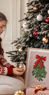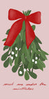 En poetisk hyldest til juletidens romantik: En elegant buket mistelten bundet med rød sløjfe svæver centralt på en lys, rolig baggrund, klar til et stjålet kys. Klassisk, tidløs og let nostalgisk – et motiv der spreder varme og forventning i entré, stue eller soveværelse. Design af Athene Fritsch. Perfekt som julehilsen.
