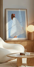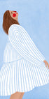 Cette œuvre montre une figure féminine calme vêtue d’une robe à rayures blanches sur un fond bleu doux. Le style minimaliste met l'accent sur les lignes élégantes et la palette de couleurs apaisantes, en se concentrant sur les thèmes du calme et de la grâce.