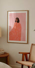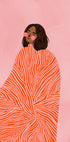 Une femme enveloppée dans une cape fluide à motifs orange vif sur un fond rose tendre. Cette illustration contemporaine capture la chaleur et le style avec une expression minimaliste et abstraite, parfaite pour les amateurs d'art contemporain en quête d'inspiration.