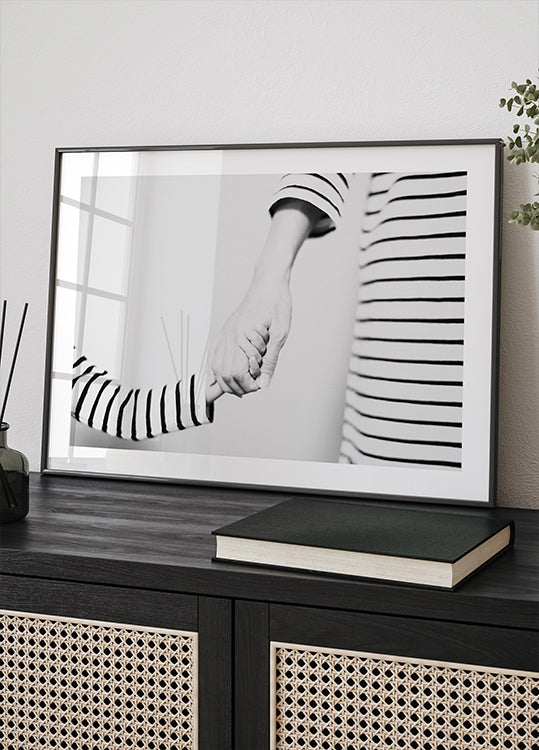 Cette touchante affiche en noir et blanc capture la beauté de la connexion et de la confiance. Un moment de tendresse entre deux mains, encadré par des vêtements rayés, symbolise l'amour, la famille et la communauté. Minimaliste mais profondément émotionnel, une pièce intemporelle qui s'intègre parfaitement dans les maisons modernes et classiques.