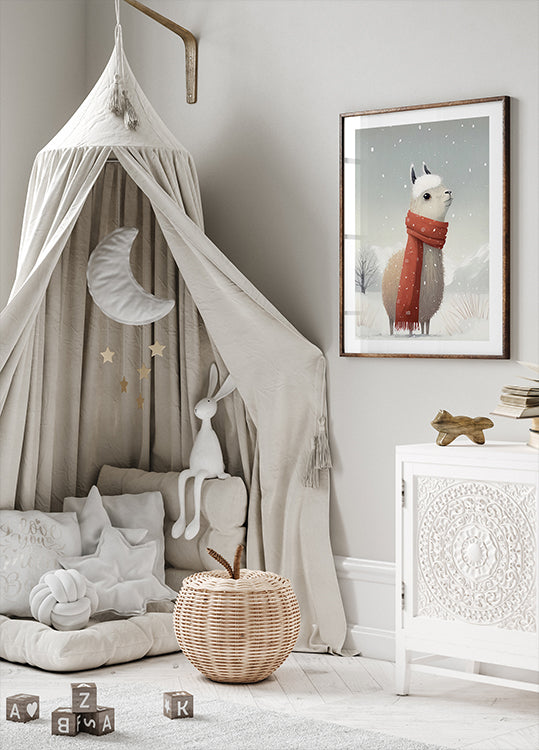 En rolig lama står i et sneklædt landskab, dens varme blik og lette ånde tegner et poetisk øjeblik af vinterlig stilhed. De dæmpede toner og enkle linjer skaber nordisk ro og pastoral charme i hjemmet. Et stemningsfuldt motiv af Bilge Paksoylu, der indfanger naturens stille nærvær. Perfekt til nordiske interiører.